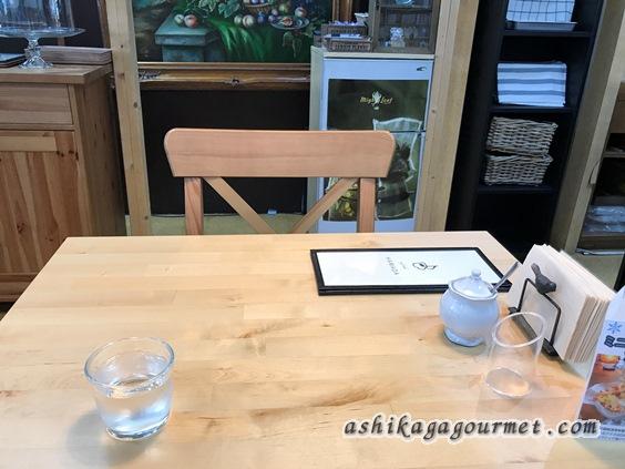 白木のテーブルに明るい雰囲気のカフェ。