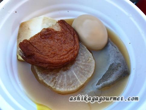 ダシがしみ込みすぎていますが、子供の頃に食べた時にはもっと卵の白身が燻製のように茶色くなっていたので、それに比べると普通のおでんです^^