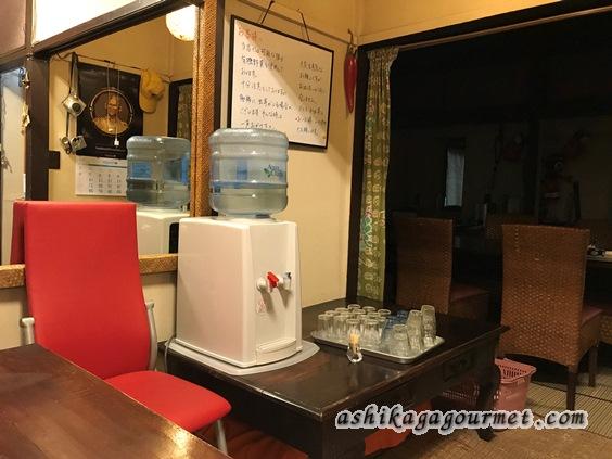 店内は左がメインのダイニング、右側は予備のテーブル、セルフサービスのお冷が置いてあります。
