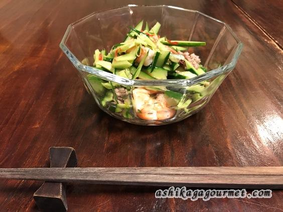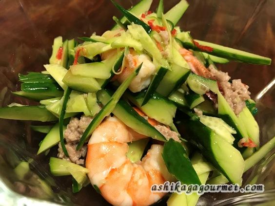 きゅうりにボイルしたエビ、豚ひき肉が入ったレモン風味のさっぱりとしたサラダです。鷹の爪も少々入っていてピリ辛風ですが、それほど辛くはないので、辛い物が全くダメという人意外は普通に食べられると思います。