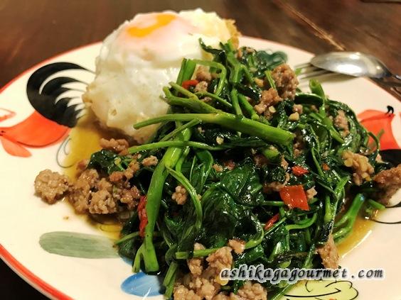 「空芯菜」という、ほうれん草と水菜の中間のような、芯がシャキシャキする葉野菜と挽肉を炒めたものにライスが付いた料理です。野菜炒めだけのバージョンもあります。