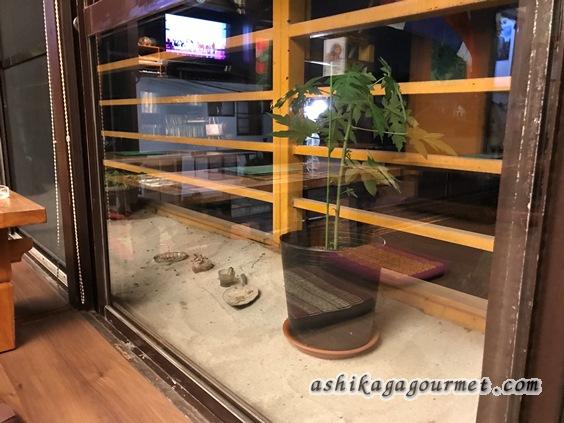 ベランダのスペースには白い砂が敷いてあり、小さな仏像やオブジェが置かれていてミニ石庭のようになっています。昼間は向かいの鑁阿寺のお堀が見えます。