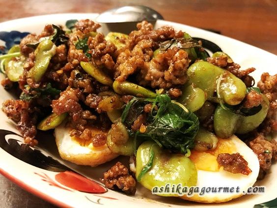 こちらは、先ほどの空芯菜をソラマメに替えたというか、バジルと魚醤の効いた甘辛い味付けの野菜炒めです。下には揚げたゆで卵が3切れ(卵1個半分)入っています。