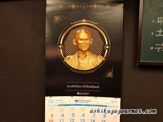 壁には、2016年に崩御されたプミポン国王(若き日)のカレンダー。
