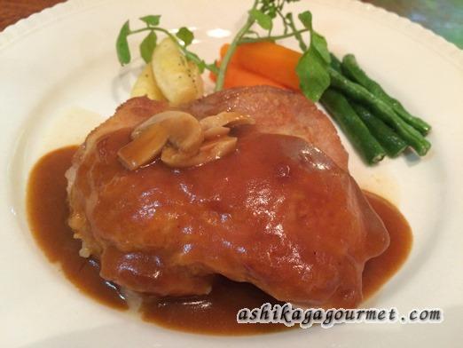 手こねハンバーグという感じで、きめの細かい挽肉です。デミグラスソースはあっさり目。