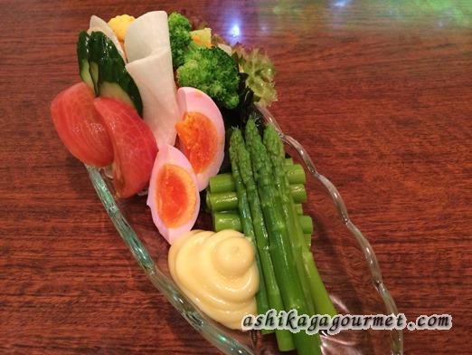 わかめ、アスパラガス、ブロッコリー、カレー味のカリフラワー、トマト、ゆで卵、きゅうり、大根の千枚漬けのようなものにみょうがまで。