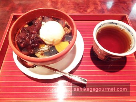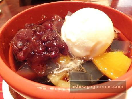 つぶあん、バニラアイス、フルーツにたっぷりの寒天。