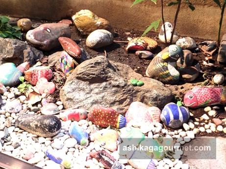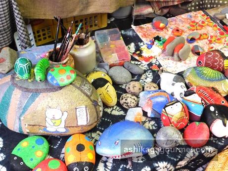 動物や昆虫、人物など、石にペイントを施した作品がたくさん並べられています。