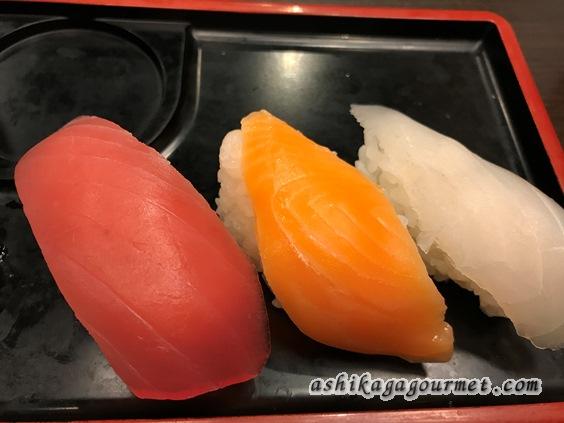 運ばれてきた食べ放題のお寿司(マグロ、サーモン、すずき昆布〆)