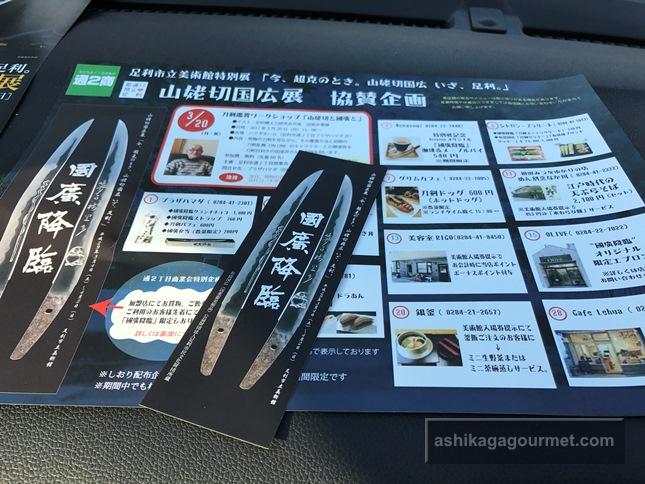 協力店でもらえるコラボ企画のチラシとオリジナルの「國廣降臨」のしおり。