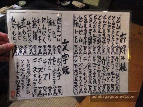 お好み焼きと文字焼のメニュー。