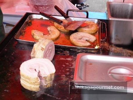 ドラムの様な厚切りチャーシューを鉄板で漕げないよう低温で焼いています。