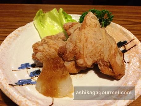 ムネ肉を薄く切り、生姜醤油につけ、片栗粉をまぶして揚げてあります。