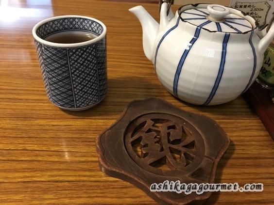 着席すると出てきたお番茶。急須のコースターは「銀」の透かし彫り。