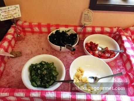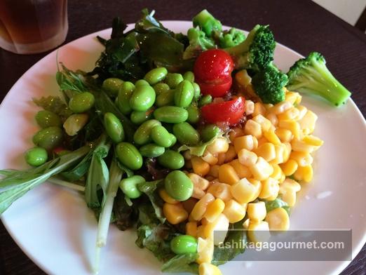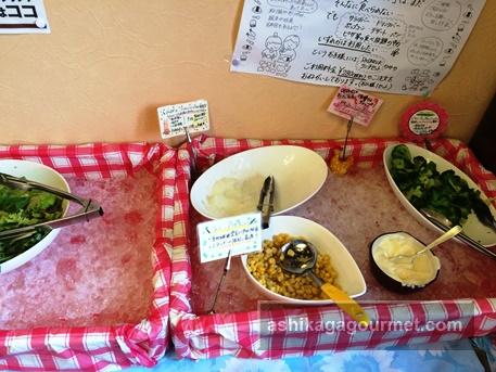 サラダバーは、グリーンリーフ、オニオンスライス、コーン、ブロッコリー、