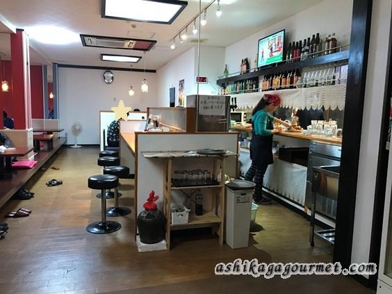 店内に入ると右に厨房、中央にカウンター席、奥にテーブル席、窓際には小上がり席があります。