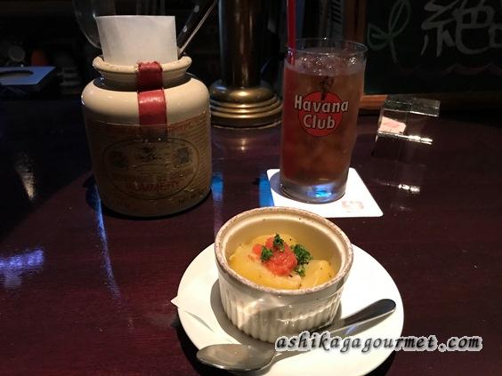 出てきたお通しはじゃがバター明太子。和洋折衷メニューですね。チャージ300円。