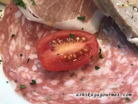 これはボローニャソーセージ?8mmくらいの厚切りなのでテリーヌのようにも見えますが、肉がぎゅっとつまったしっかりとした歯ごたえです。塩味はきつくないので、自家製なのかもしれません。