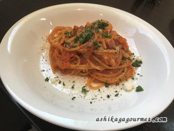 貝類は苦手だと伝え、ペペロンチーノ以外がいいかなと思っていたら、出てきたのは「アマトリチャーナ(トマトソース、玉ねぎ、ベーコン)」でした。