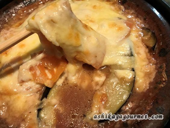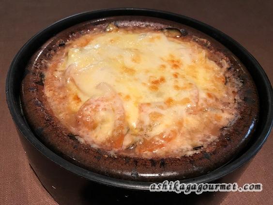 なすとトマトのの上にナチュラルチーズをのせて陶板焼きで焼いたものです。普通ならば、トマトソースのところ、味噌が入っているところが銀丸風。意外と合います。