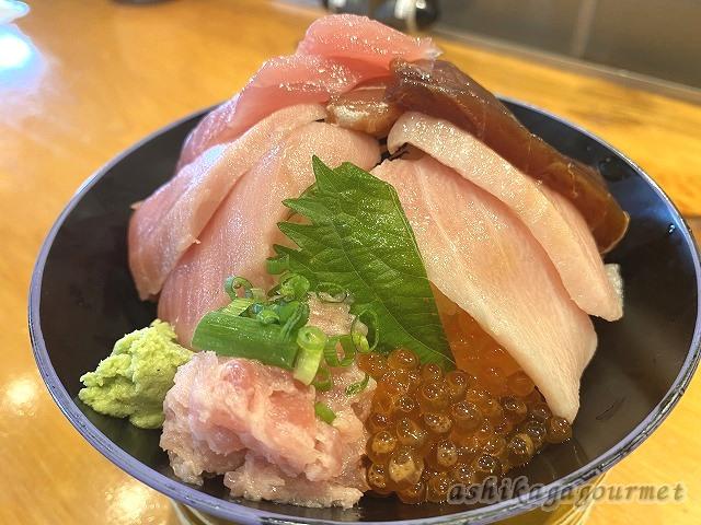奥から時計回りに、赤身の漬け、大トロ、いくら、ねぎとろ、中トロ、赤身が並んでいます。