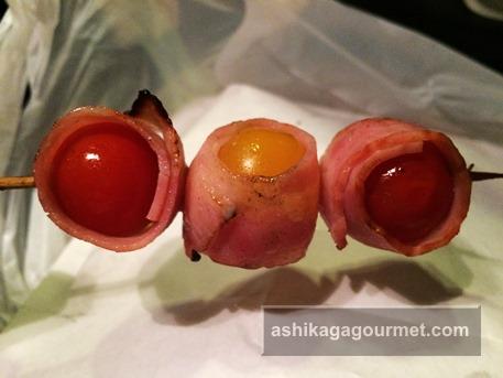 赤と黄色のプチトマトにベーコンが巻いてあります。