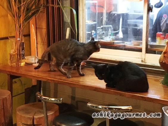 雨の日は外に座るお客さんもいないので、外のカウンター席で2匹の野良猫が談笑中。