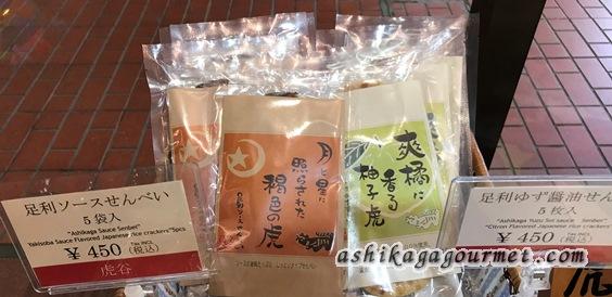 2017年11月現在、「虎谷」で販売している商品は、「巨石せんべい」、「足利ソースせんべい」、「足利ゆず醤油せべい」の3品です。