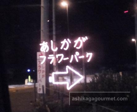 迫間町に到着すると、ネオンで「あしかがフラワーパーク⇒」の案内が出ています(2013年当時)。ネオンの他にも要所に大きな看板が出ています(2020年11月)。