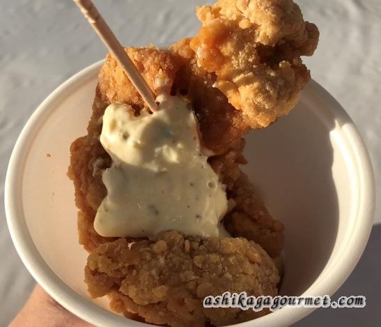 今回初出品&受賞のお店。大き目に切ったジューシーな鳥もも肉をおかきのような食感の厚めのカリッとした衣で包み、甘辛いソースとタルタルを添えた絶品からあげ。ビールが欲しくなる一品でした。実店舗もかなりの人気店です。私はこちらに投票しました^^