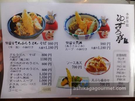 「ゆずかろ亭」のメニューは外にも掲示されていますが、フルコースの御膳メニューと一品料理があります。